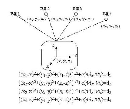 GPS的定位原理說白了就是通過四顆已知位置的衛(wèi)星來確定GPS接收器的位置。要達到這一目的,衛(wèi)星的位置可以根據(jù)星載時鐘所記錄的時間在衛(wèi)星星歷中查出。而用戶到衛(wèi)星的距離則通過紀錄衛(wèi)星信號傳播到用戶所經(jīng)歷的時間,再將其乘以光速得到(由于大氣層電離層的干擾,這一距離并不是用戶與衛(wèi)星之間的真實距離,而是偽距)。當GPS衛(wèi)星正常工作時,會不斷地用1和0二進制碼元組成的偽隨機碼(簡稱偽碼)發(fā)射導航電文。導航電文包括衛(wèi)星星歷、工作狀況、時鐘改正、電離層時延修正、大氣折射修正等信息。然而,由于用戶接受機使用的時鐘與衛(wèi)星星載時鐘不可能總是同步,所以除了用戶的三維坐標x、y、z外,還要引進一個變量 t 即衛(wèi)星與接收機之間的時間差作為未知數(shù),然后用4個方程將這4個未知數(shù)解出來。所以如果想知道接收機所處的位置,*少要能接收到4個衛(wèi)星的信號。如下圖所示: