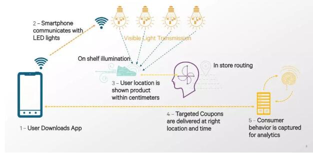 目前,可見光技術(shù)在北美有很多商場已經(jīng)在部署。用戶下載應用后,到達商場里的某一個貨架,通過**貨架周圍的燈光即可知曉具體位置,商家在通過這樣的方法向消費者推動商品的折扣等信息。